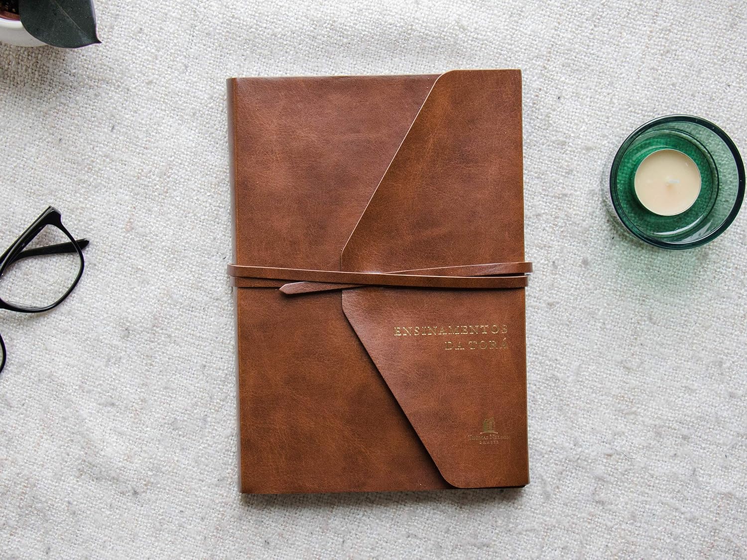 Design cuidadoso e sofisticado com capa em couro sintético e fecho em tira.